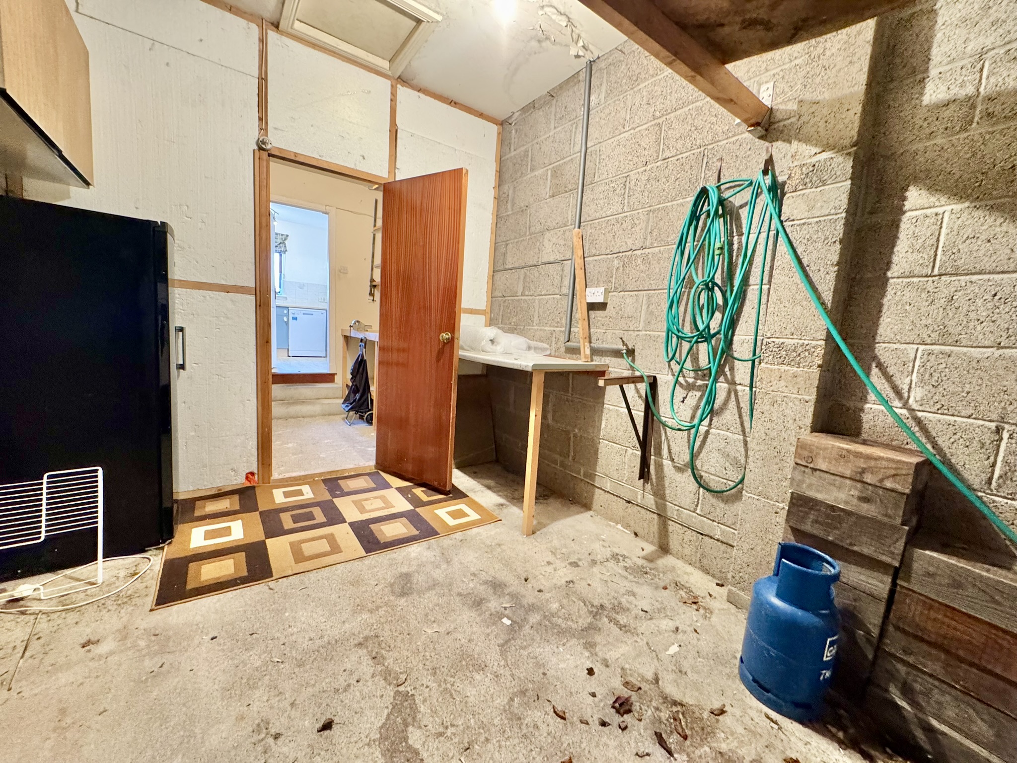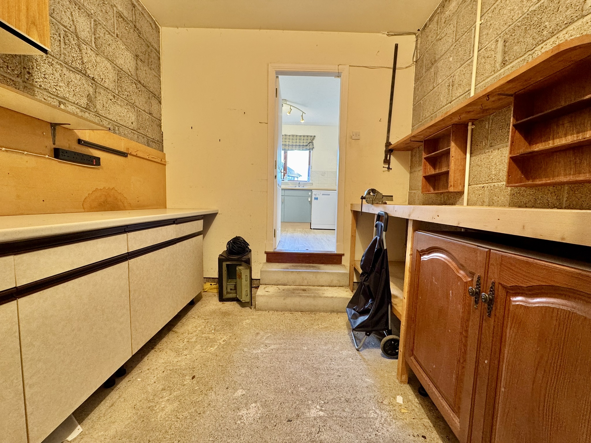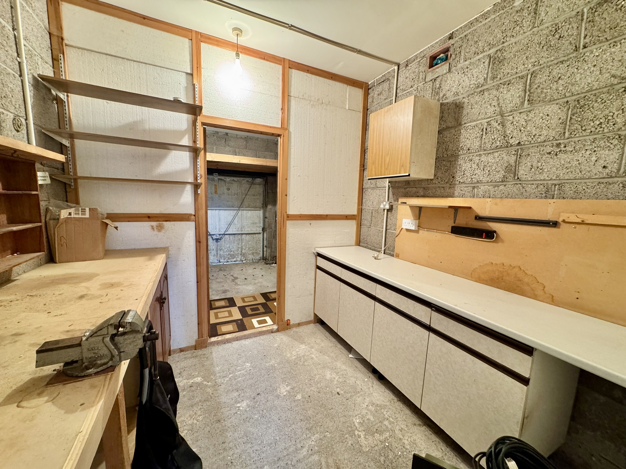 The property features an attached garage and adjoining workshop, both accessible directly from the kitchen, providing excellent storage and hobby space.